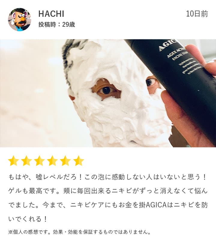 毛穴の古い角質を根こそぎ優しく、取り除いてくれる濃密な炭酸クレイ洗顔。しかも化粧水並みの美容成分が洗った後もつっぱらずにモチモチに! AGICA AGEX ACTIVE フェイシャルソープ。これは感動モノ。
