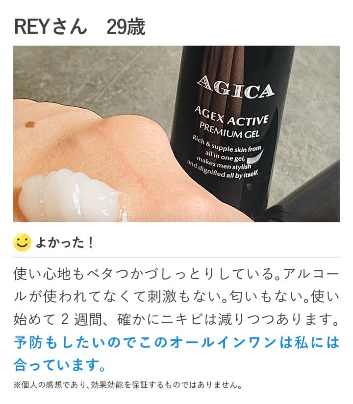 薬用オールインワンゲルAGICA AGEX ACTIVE プレミアムゲル。医薬部外品の確かな効果でニキビ・肌荒れ・乾燥小じわ・年齢に応じたエイジングケアまでしっかりカバーしてくれます!塗った瞬間とろけて角質まで浸透していく感じが確かにいい。